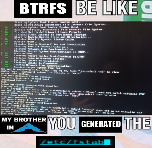 ca_certificates, which Firefox absolutely needs. “Great, I’ll just reinstall.” Nope! I just deleted my pacman cache, and pacman also needs those certificates to download from the Arch repo’s mirrors! “Fantastic,” I grumbled while I tried to think of how I could get this pesky package back on my machine.Then it occurred to me: I’ve been keeping up with my btrfs snapshots (for once, lol)! I can just backup to yesterday and forget this whole mess! So I bring up Timeshift, and we’re on our way back to a functioning system! Or so I thought. See, I don’t have a separate /home partition, but I do have a separate @home subvolume, so when Timeshift asked me if I wanted to restore that too, I clicked the check mark. Only thing is, I don’t think I actually have a separate @home subvolume, which brings us to the error in the meme. /home wouldn’t mount, and that meant I was borked.