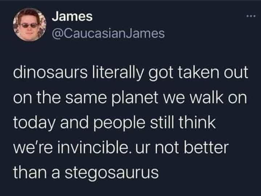 Not fair to the dinosaurs. The dinosaurs got hit by a meteor, humans are destroying themselves.