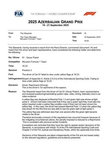 arrow-up110arrow-down1imageOscar Piastri received a reprimand for failing to slow under yellow flag during FP2.sh.itjust.worksalphacyberranger@sh.itjust.works to Formula 1@lemmy.worldEnglish · 2 months agomessage-square2linkfedilink
