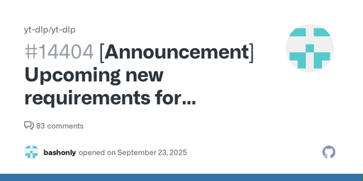 RSS Bot@lemmy.bestiver.seMB to Hacker News@lemmy.bestiver.seEnglish · 1 month agoYt-dlp: Upcoming new requirements for YouTube downloadsgithub.comexternal-linkmessage-square1linkfedilinkarrow-up112arrow-down10file-textcross-posted to: technology@beehaw.orgtechnology@lemmy.worldpiracy@lemmy.dbzer0.com