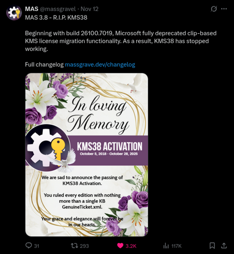 And Microsoft might actually have broken this by accident. If they wanted to get rid of massgrave they would probably start by deleting the github org.