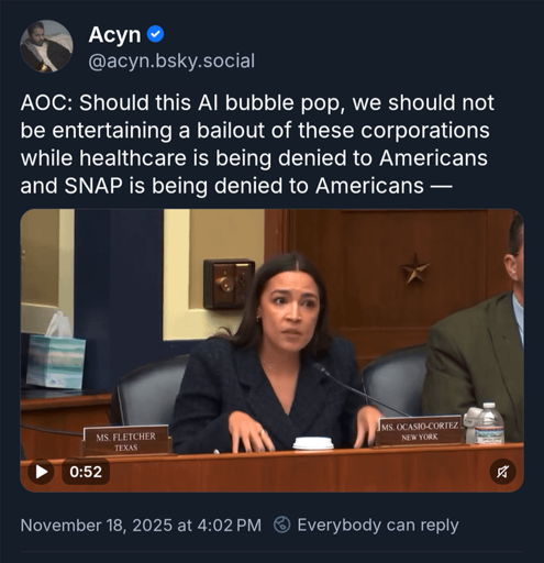 Its only a matter of time before the AI companies run out of investor money without having a source of revenue and profit generation to pay for all this infrastructure, and that’s when the bubble pops. However I think we will be waiting for a very long time for that to happen, since the funding ultimately comes from tech companies who have stashed away probably a combined trillion dollars in cash over the last decade. The problem is, that pulls in more than just Nvidia and openAI; by market cap we’re talking about a handful of tech giants that make up like 40% of the S&P500.