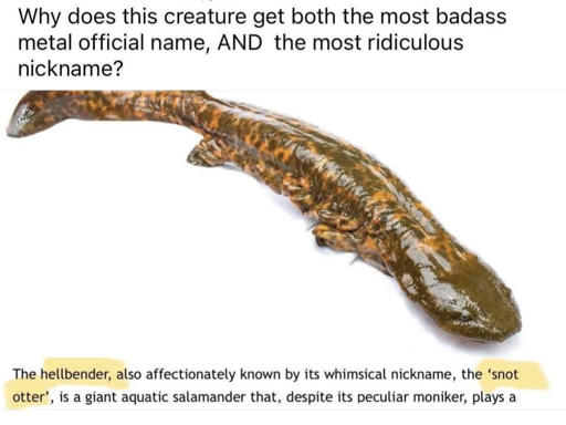minus-squareedgemaster72@lemmy.worldlinkfedilinkEnglisharrow-up12·7 days agoSnot otter? I barely know her!
