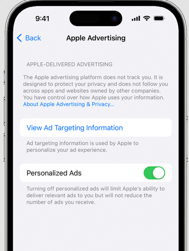 Settings -> Privacy & Security -> (scroll down) -> Apple Advertising