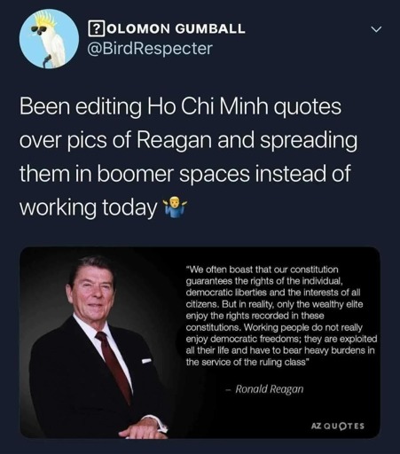 While I like the sentiment, Ho Chi Minh very intentionally styled his english after speeches given by americans like Regan (genius propaganda move), which is why his quotes sound so much more plausible as legitimate regan lines. Mao wasn’t eloquent in nearly the same way, which is a big part of why those so clearly aren’t regan quotes. It just doesn’t sound like him.