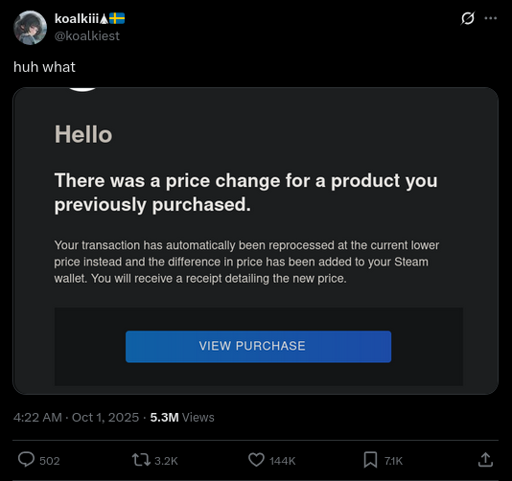 So unlike how it looks, this isn’t about a game going on sale. When this happens, it’s about differences in regional pricing. Like a year ago, Poland was upset they were being charged the second most for games on steam, when they don’t make that kind of income on average. So steam changed their regional pricing index, and games across the board got cheaper for polish users and a few other countries. Looks like they do this for recently purchased games when that happens. Not sure how many times this has happened, but I doubt it’s very often.